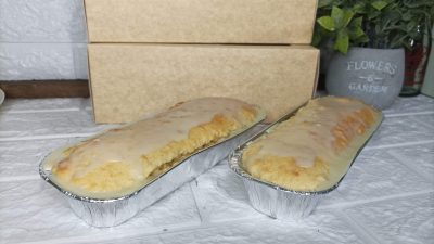 Budín de limón con baño de ganache de chocolate blanco.