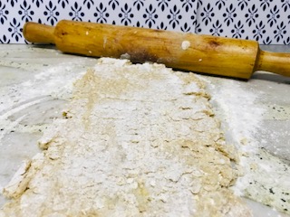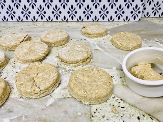 Estiramos la masa sobre una mesada enharinada con harina de avena, que quede de unos 2 o 3 cm de alto y luego cortamos los scones.