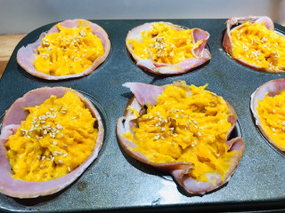 Colocar las fetas de lomito en moldes para cupcakes, rellenar con el puré de zapallo y en el centro colocar un cubito de muzzarella.