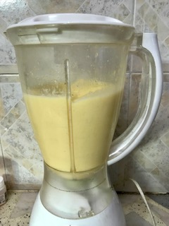 Licuar 2 naranjas sin cascara ni hollejo, el jugo de la otra naranja, el aceite, el edulcorante, los huevos, la vainilla y la miel.