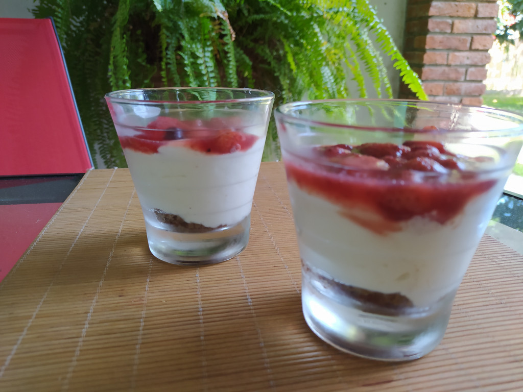Lavar las frutillas y cortar a la mitad. Poner a macerar con 2 cdas. de edulcorante y el jugo de las naranjas.