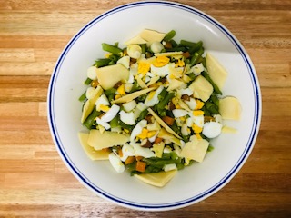 Colocar en un molde las verduras y agregarle el huevo y los palmitos picados.
