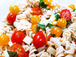Agregar los cherrys, el queso en cubitos y la albahaca.