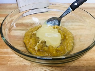 Rallar la manzana y agregarle el edulcorante, la canela y la mantequilla de maní.