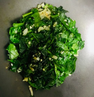 Retirar la pechuga y sofreir el ajo, la cebolla y la espinacas picadas.