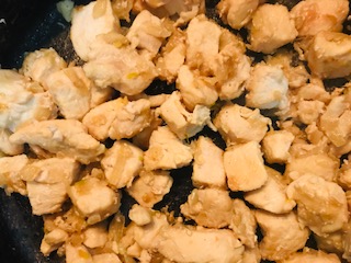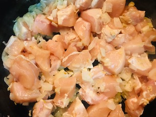 Fritamos la cebolla picada chica en un sartén con un poquito de aceite, cuando esté dorada agregamos el pollo cortado en cubos.