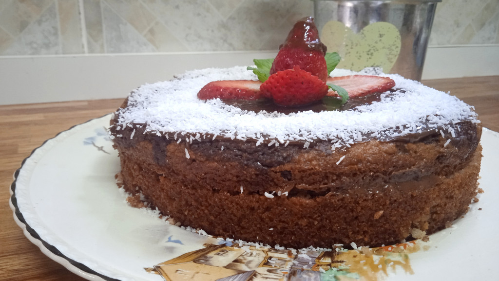 Colocar en un molde de 20 cm de diámetro aceitado o forrado con papel manteca previamente la mitad de la mezcla de vainilla, luego incorporar la mezcla de chocolate dejando caer sobre la mezcla anterior y terminar con el resto de las mezcla de vainilla.